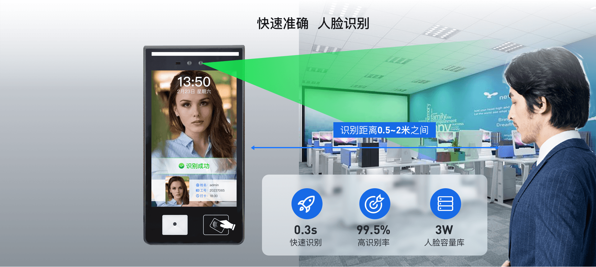 支持双目活体检测技术,有效防范照片、视频、模型等攻击行为;99.5%的识别率;人脸识别时间<500ms;